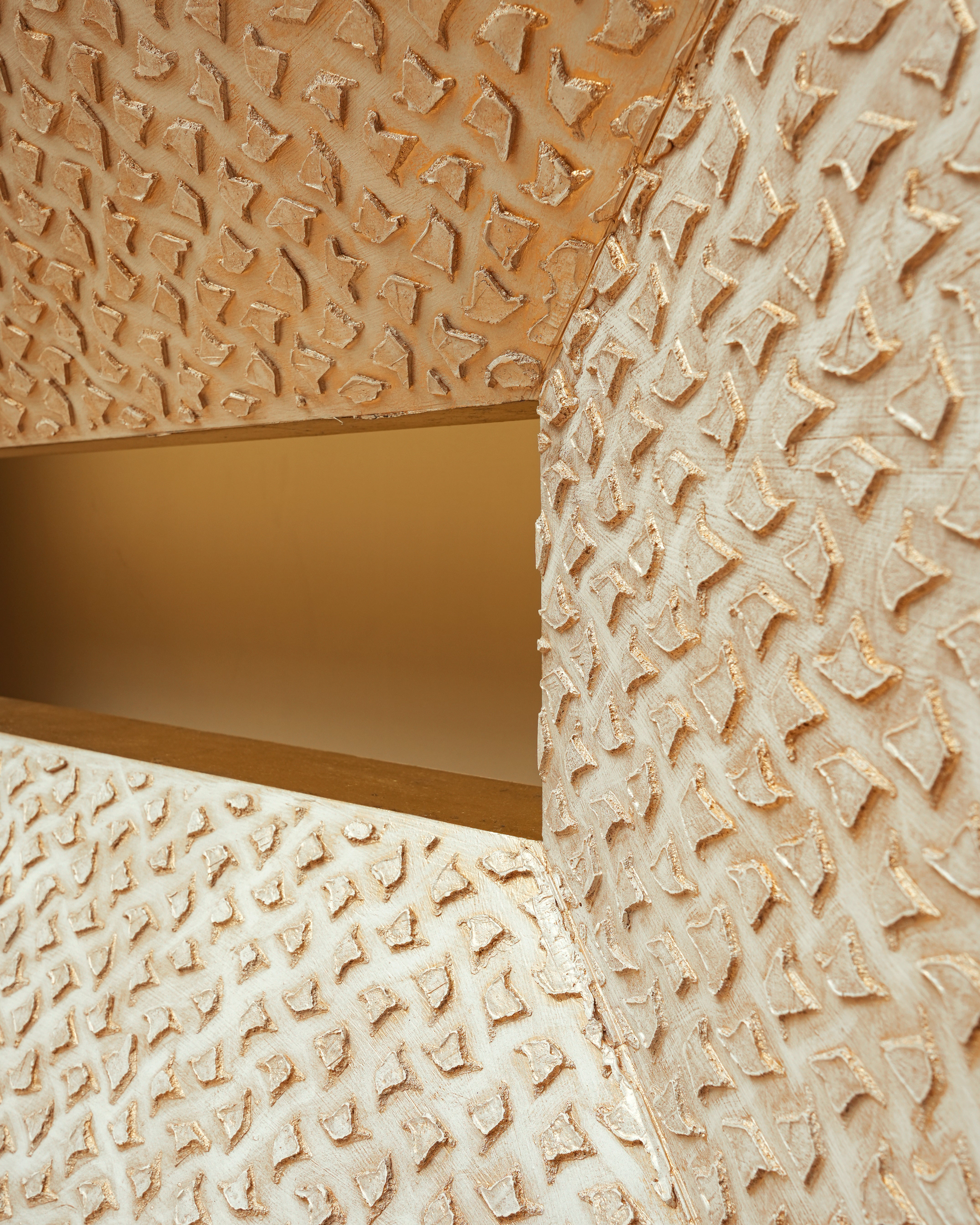 A close-up of the console highlights its rich texture and finely crafted surface details.
